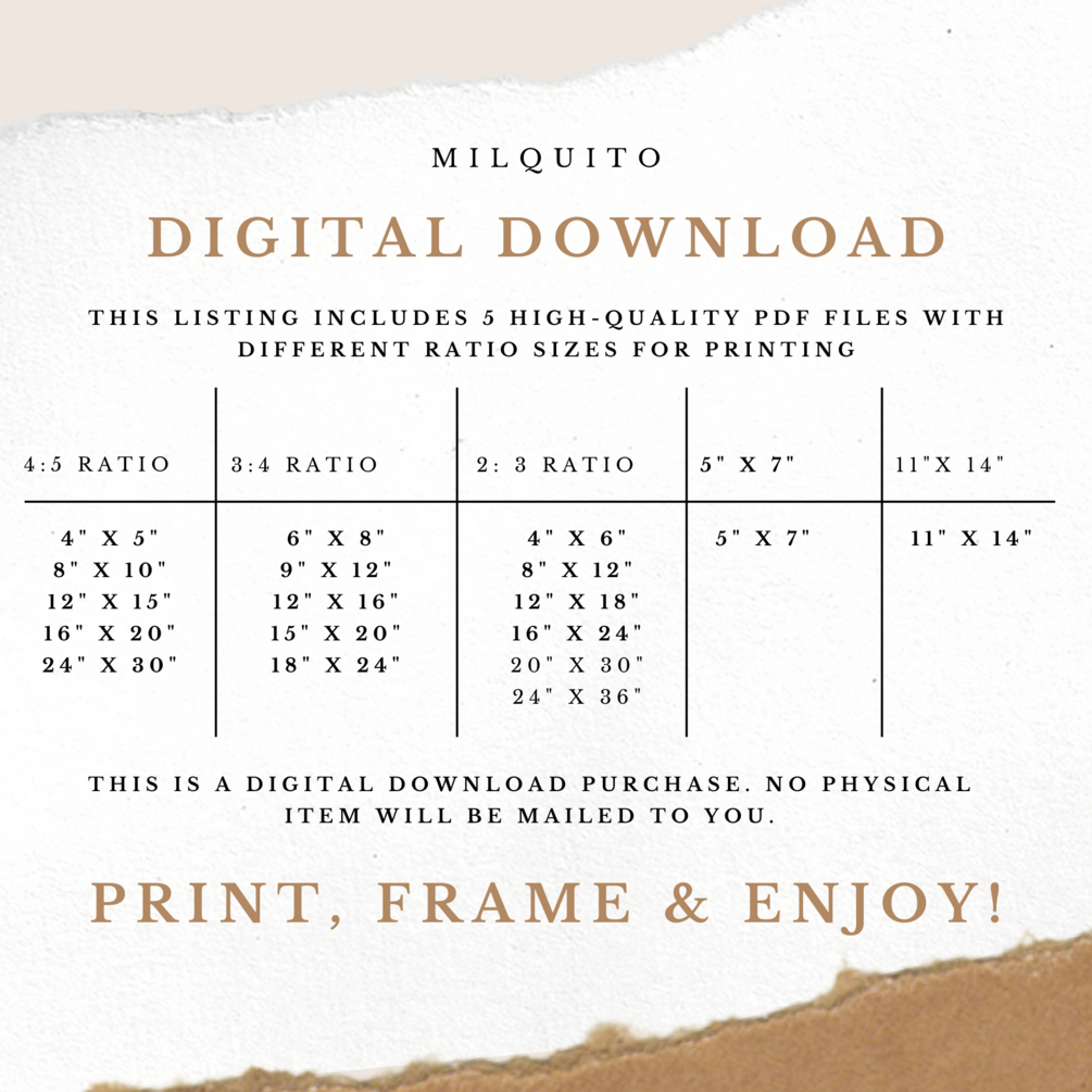 You will receive a PDF file containing a link to your zipped folder with 5 high-quality PDF digital files for your art printable, a separate instructions PDF file and jpg file. A 4:5 ratio file for printing sizes: 4”x5”, 8”x10”, 12”x15”,16”x20”, 24”X30” A 3:4 ratio file for printing sizes: 6”x8”, 9”x12”, 12”x16”,15”x20”, 18”x24” A 2:3 ratio file for printing sizes: 4”x6”, 8”x12”, 12”x18”,16”x24”, 20”x30”, 24”x36” A file for printing 5”X7” A file for printing 11”X14” Downloadable & Printing Instructions.